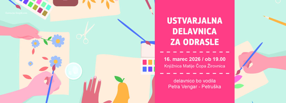 V ponedeljek, 16. marca 2026, vas ob 19. uri vabimo na ustvarjalno delavnico za odrasle. Delavnico bo vodila mentorica Petra Vengar, ki vas bo popeljala skozi svet umetniškega izražanja in vam pomagala odkriti ter razvijati vaše ustvarjalne talente. Na delavnici boste imeli priložnost izdelati lastne edinstvene izdelke, izmenjati ideje z drugimi udeleženci in uživati v sproščenem, ustvarjalnem okolju.